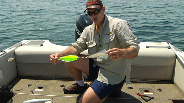 Charlie has used the Hot Spot Agitators before, but this time, he is running two of them in tandem, directly from the ball, with the release clip on the downrigger wire 3 feet above, and the Moonshine spoon only 10 and 15 feet back. The reason for this, the Agitators are a tremendous attractor, spinning and flashing, and drawing in the Salmon for a closer look, and they get excited. When they see the tantalizing action of the Moonshine spoon trailing behind, they absolutely hammer the spoon. If you run your spoons too far back, you lose the advantage of exciting the Salmon, they want something close at hand before they dart off, in another direction for food, so keep you lures fairly close to the Hot Spot Agitators. These are drawing the Salmon in.